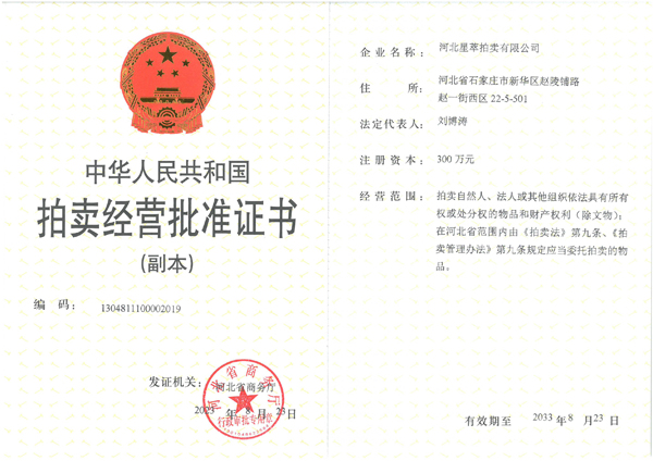 河北星萃拍卖有限公司经河北省商务厅和石家庄市审批局批准,于2018年8月27日成立,注册资本300万元,注册地为河北省石家庄市新华区赵陵铺路赵一街西区22-5-501。《拍卖经营批准证书》编号:1304811100002019;河北省拍卖协会会员单位;经营范围为:许可项目:拍卖业务。 河北星萃拍卖有限公司自成立以后,秉承“公平、公正、公开”的“三公”原则和...